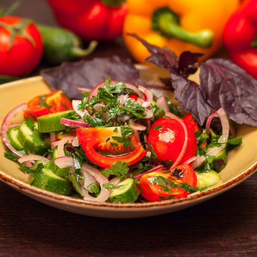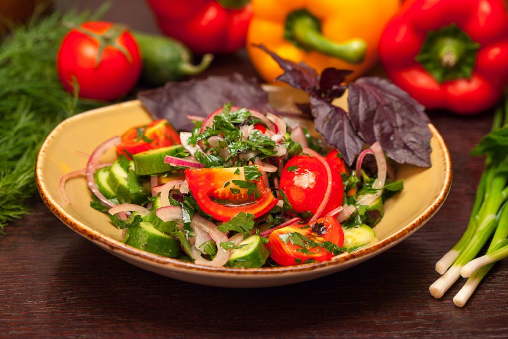 Помидоры, огурцы, лук зелёный, петрушка, уксус, базилик